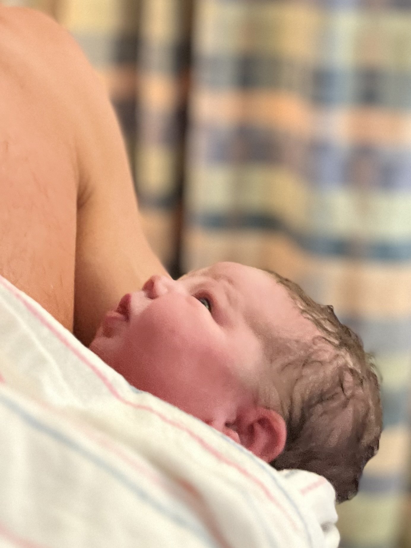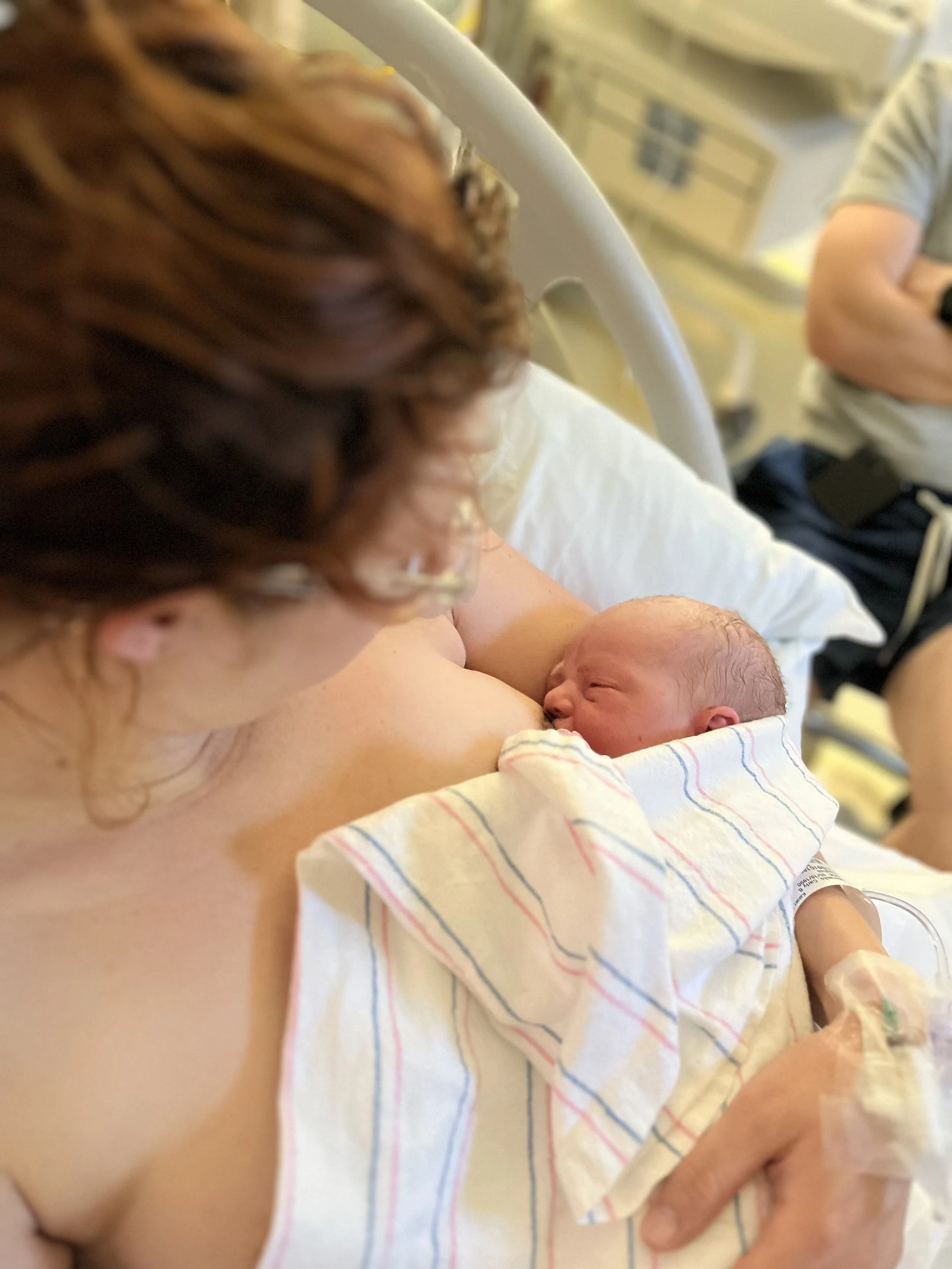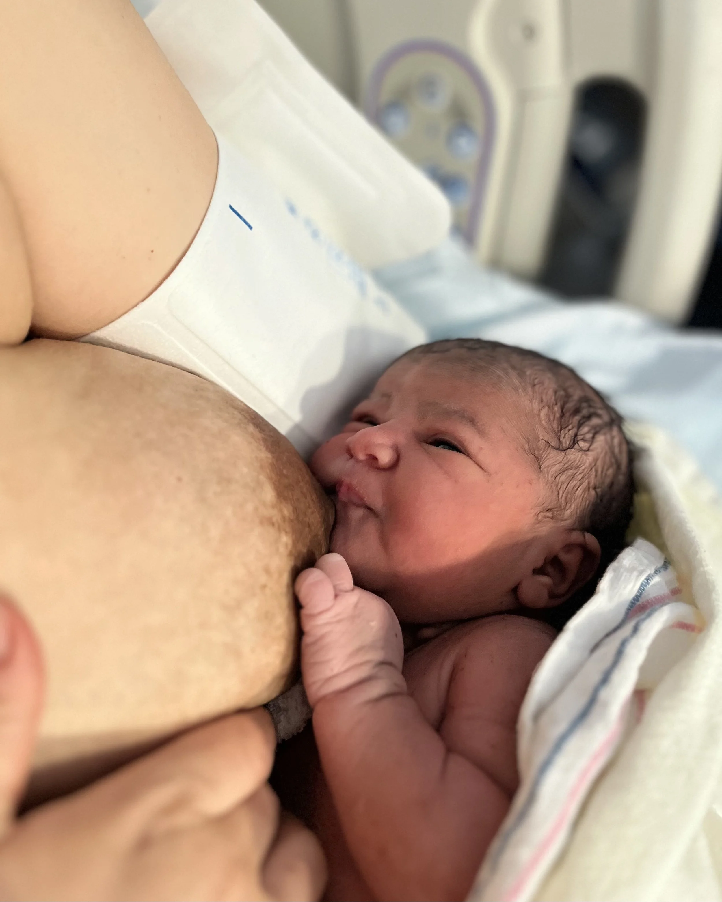 A newborn baby breastfeeding from a mother in a hospital setting.