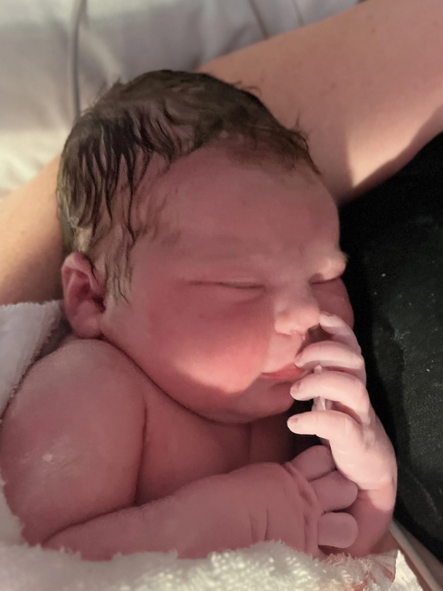 Close-up of a sleeping newborn baby with wet hair, resting on an adult's arm, with tiny fingers near its mouth.