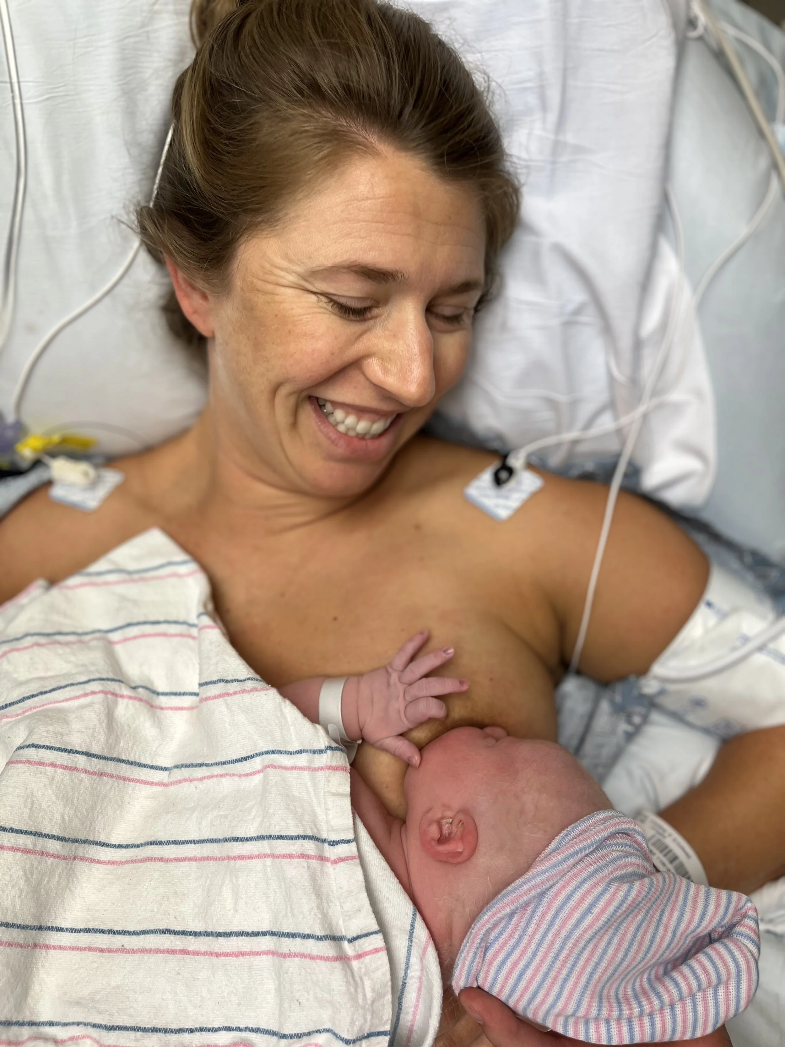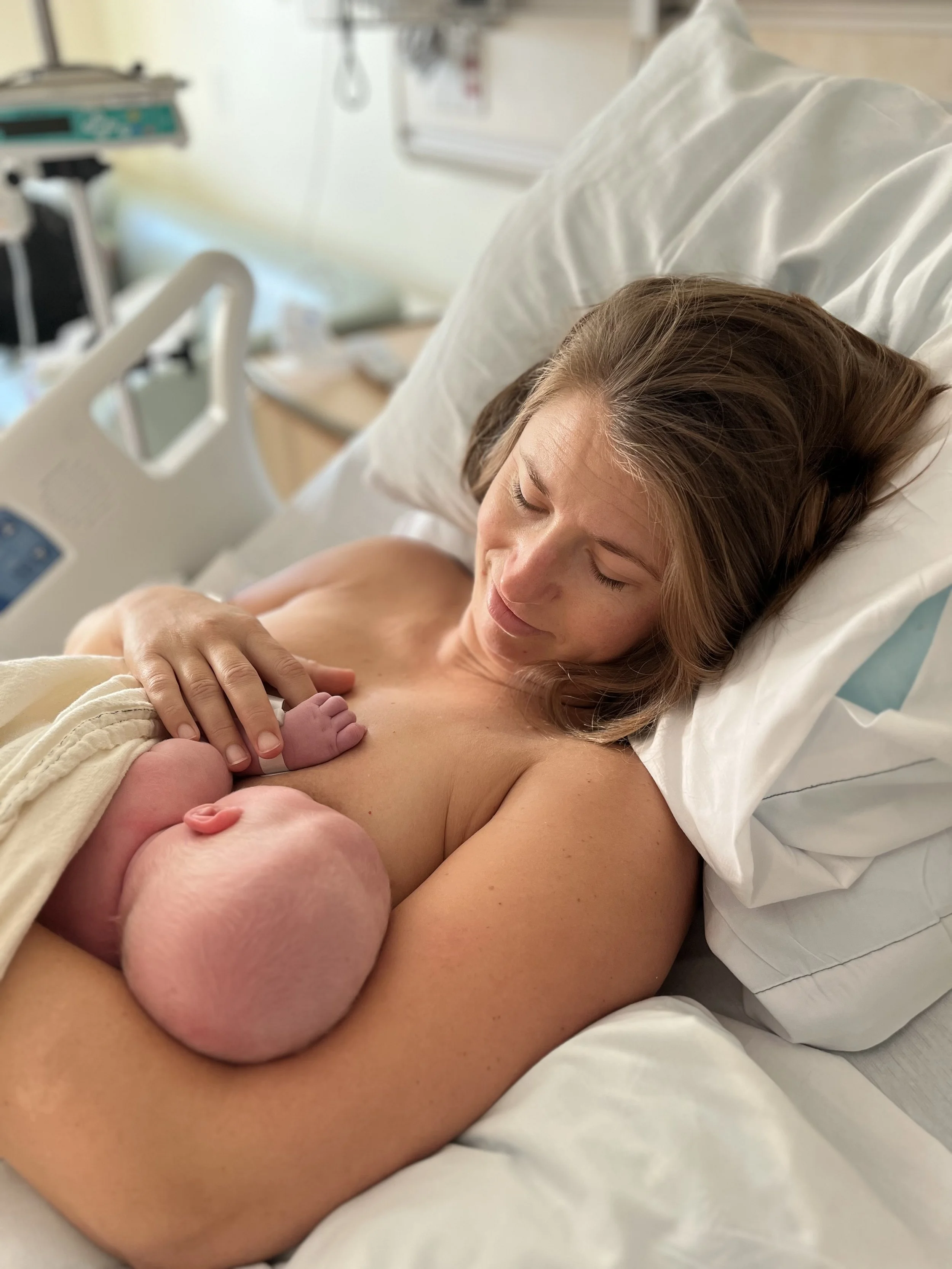 New mother lying in hospital bed holding newborn baby close, both smiling, with medical equipment in the background.