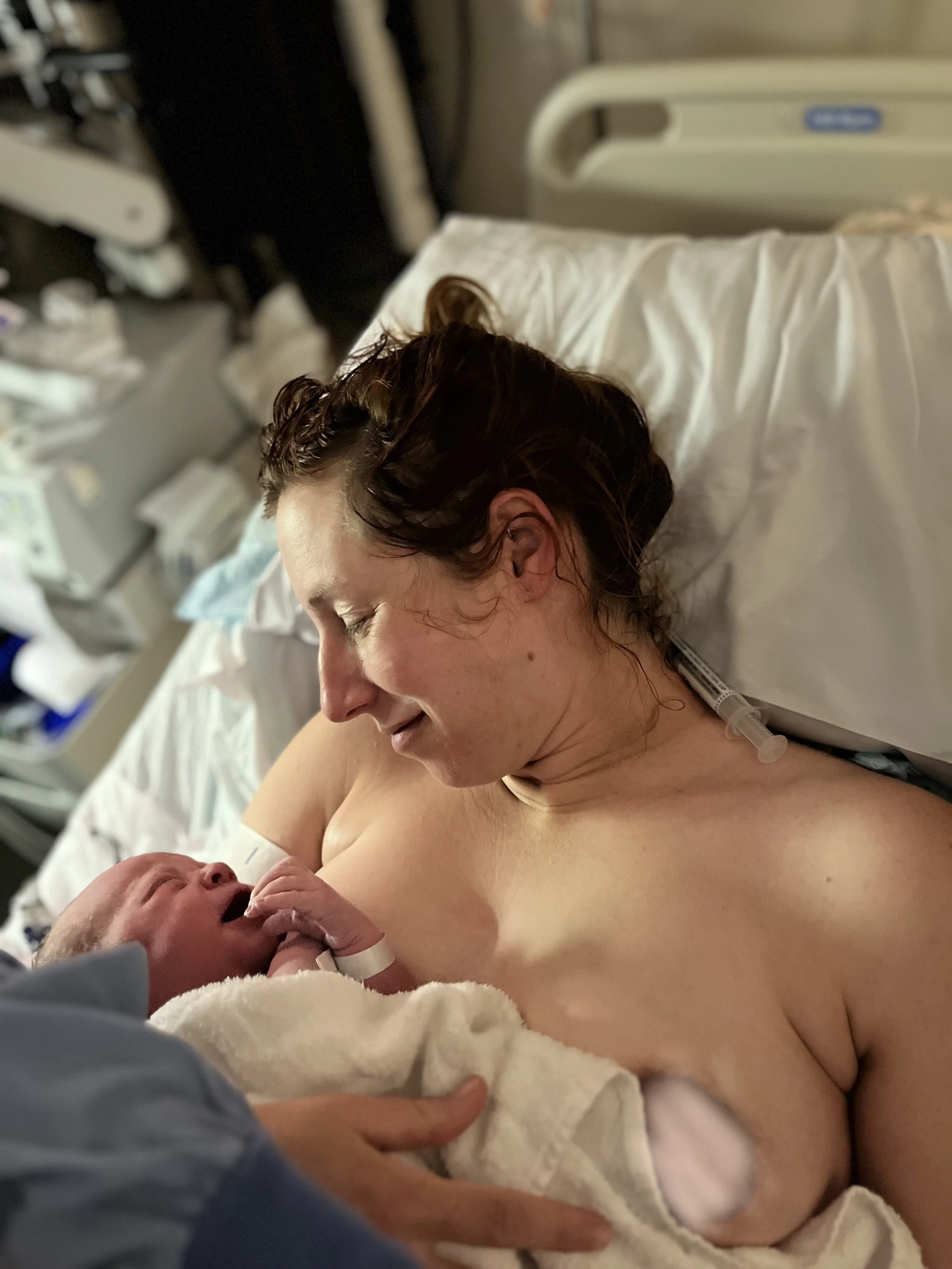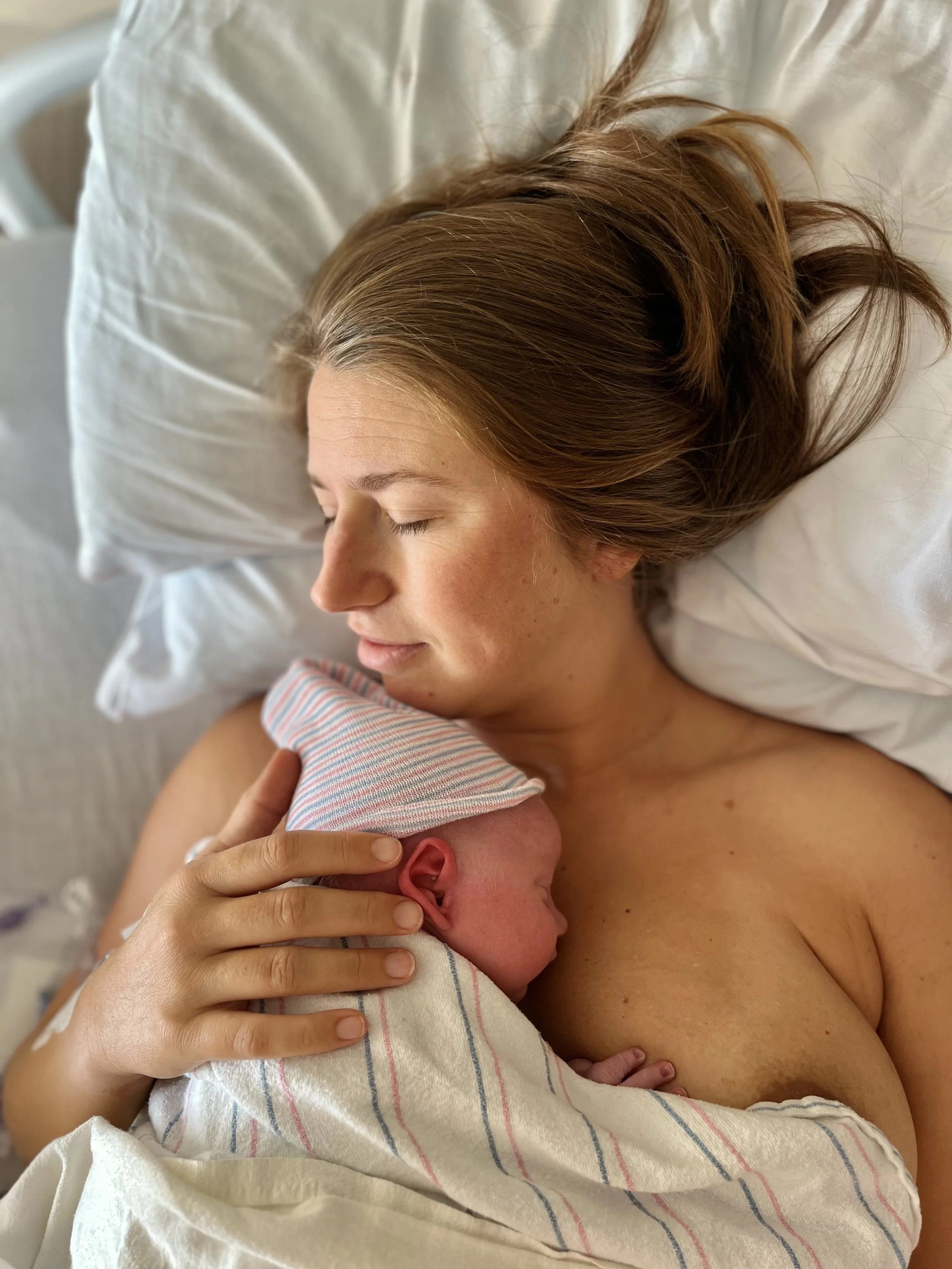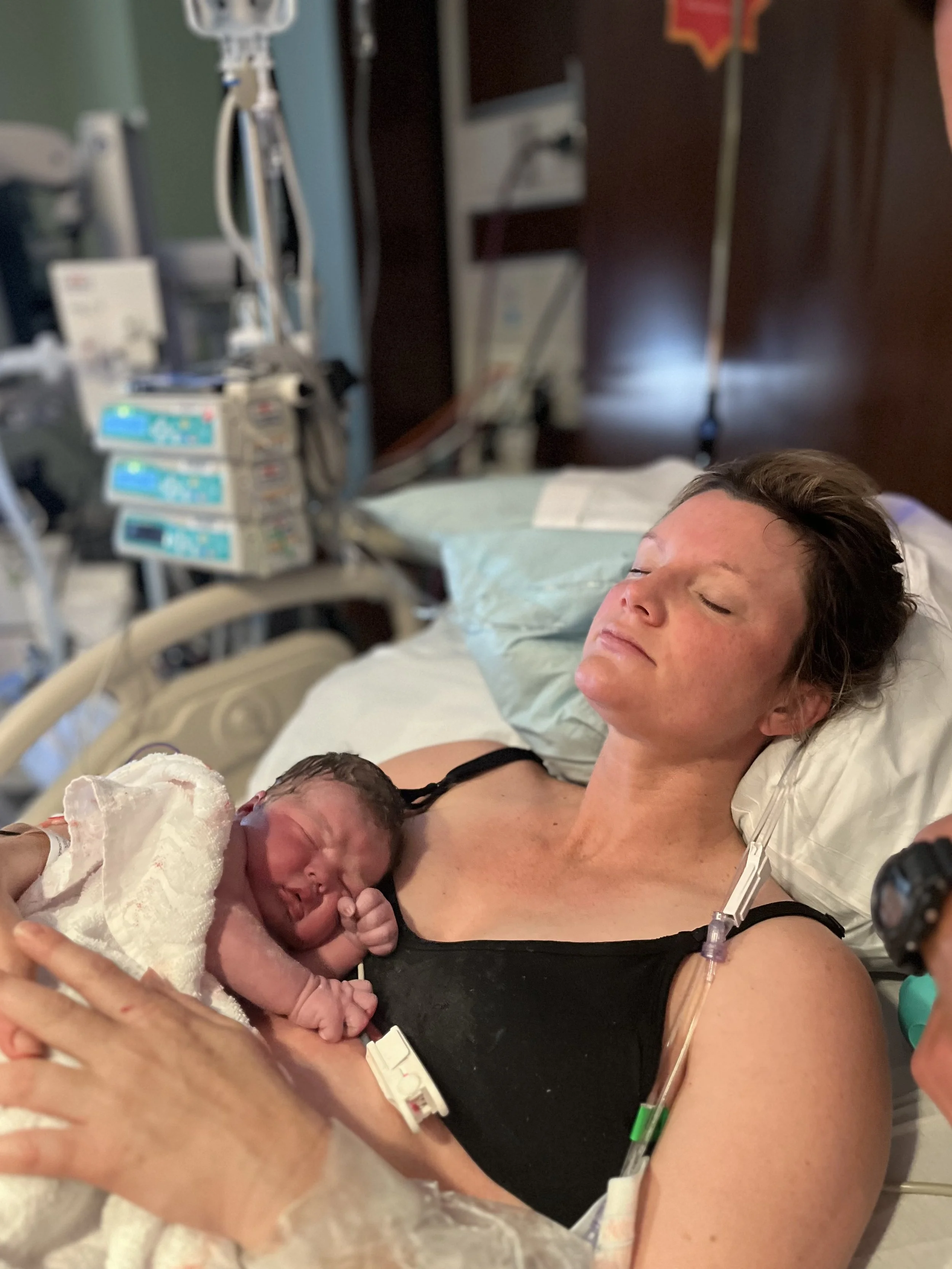A woman holding a newborn baby to her chest in a hospital room.
