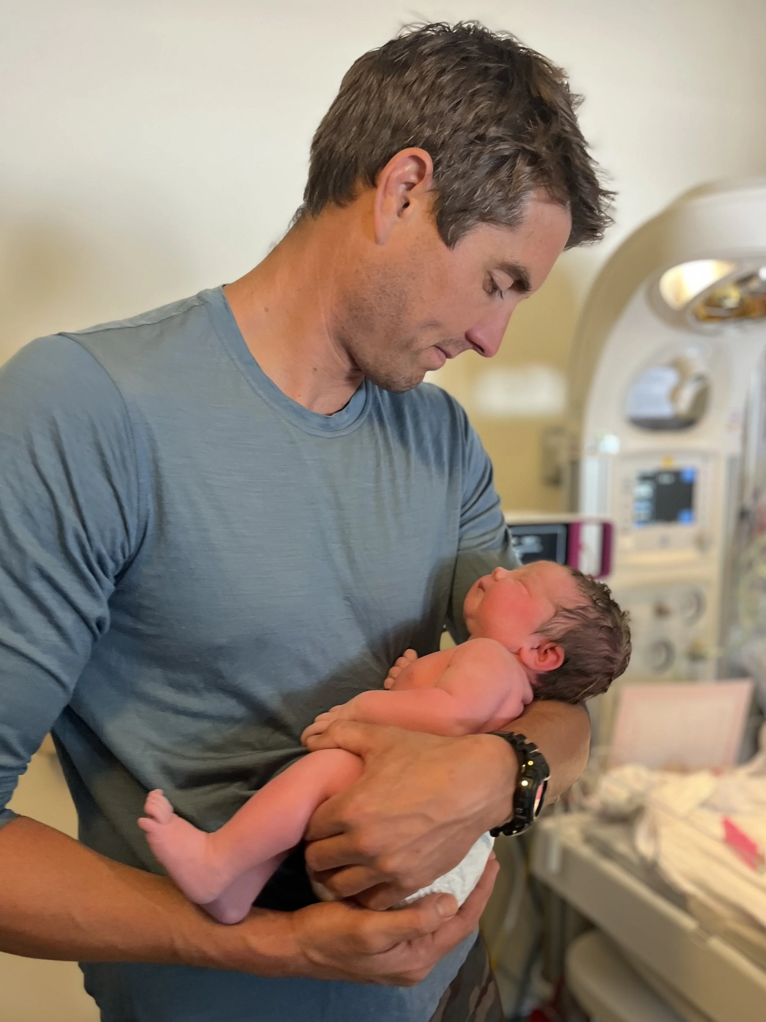 A man holding a newborn baby in a hospital room.