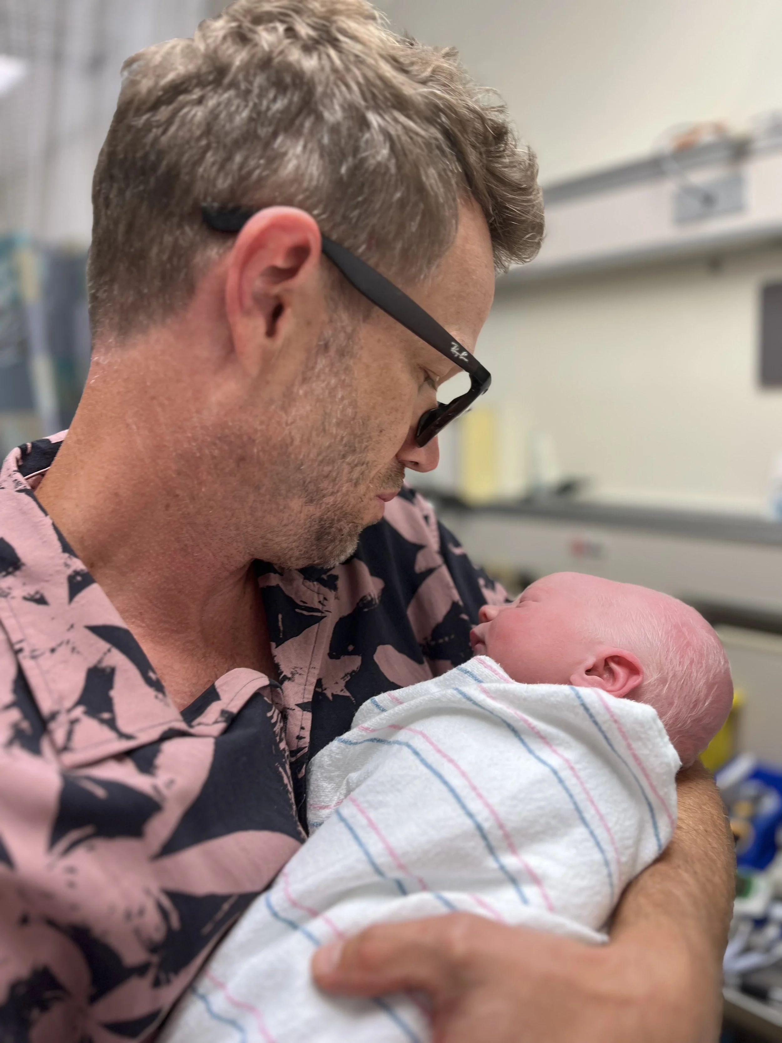 A man holding a newborn baby wrapped in a hospital blanket, looking at the baby in a hospital room.