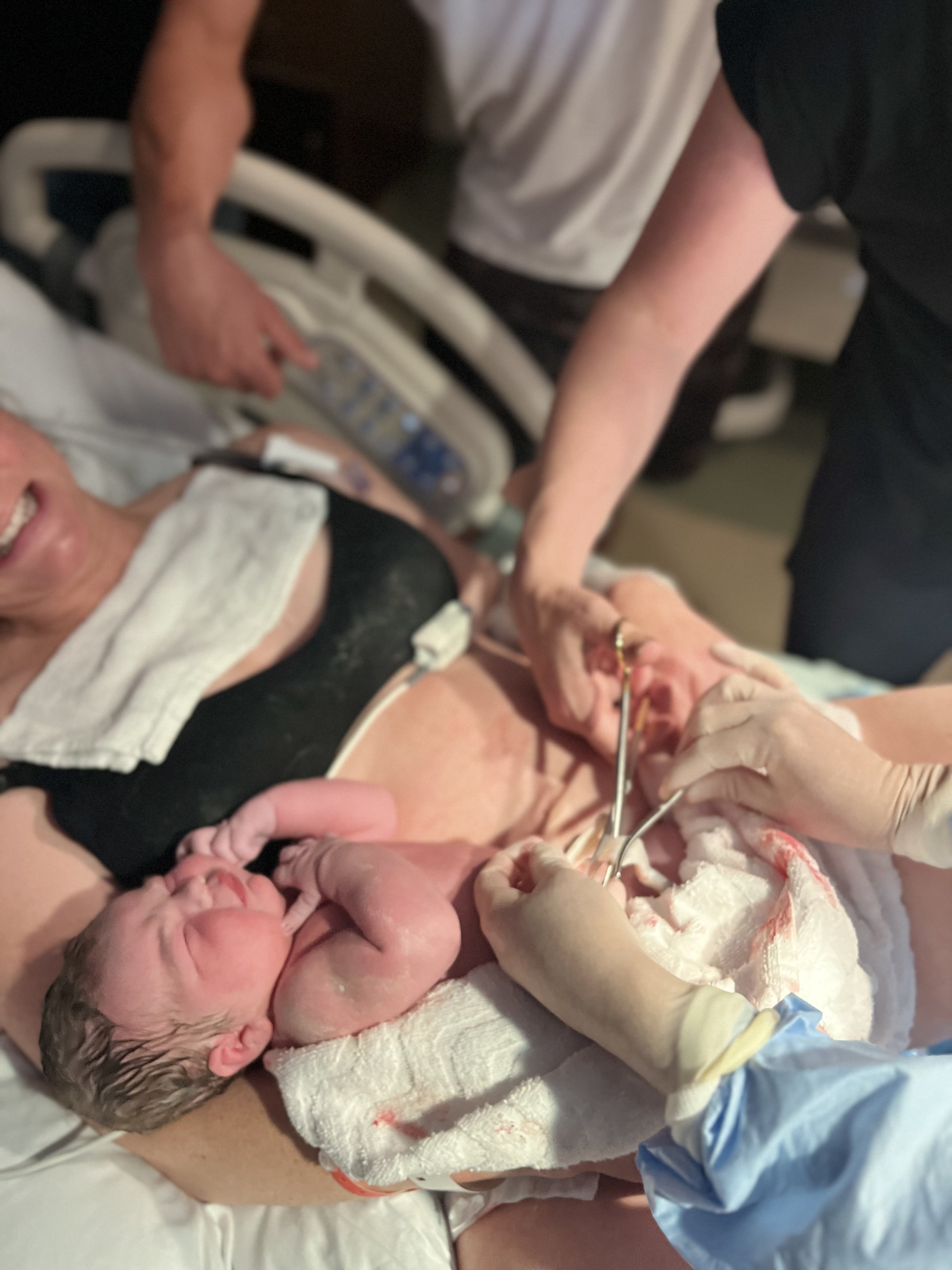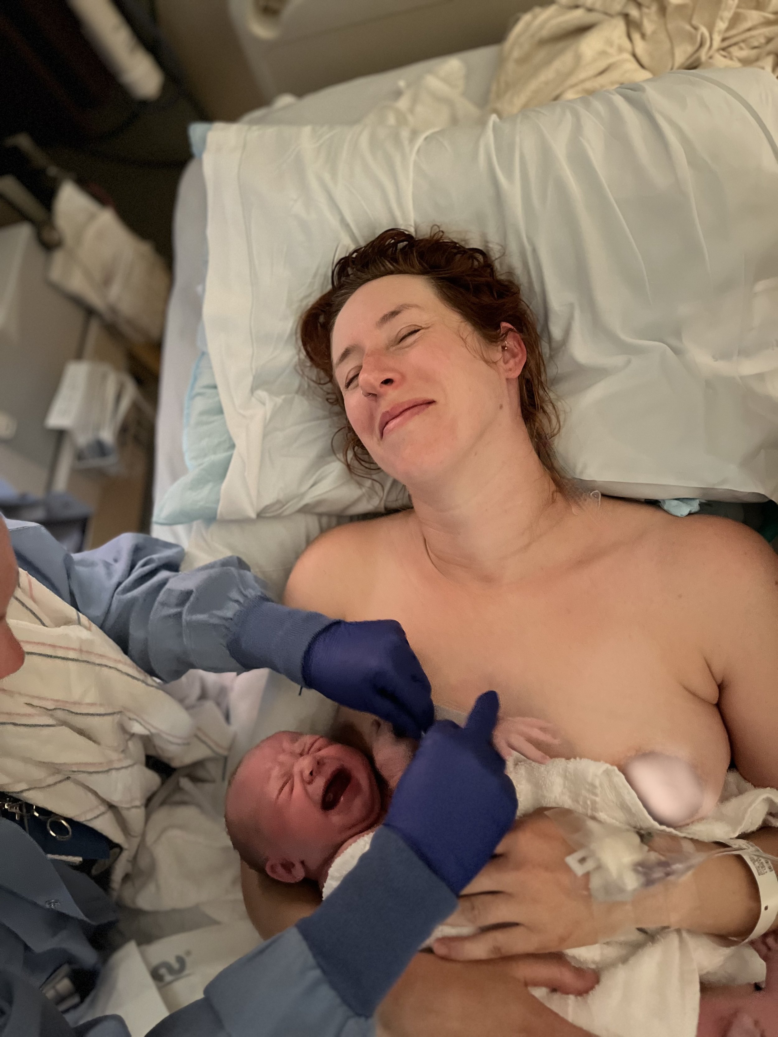 A woman lying in a hospital bed after childbirth, smiling with a newborn baby crying on her chest, attended by medical staff wearing gloves.