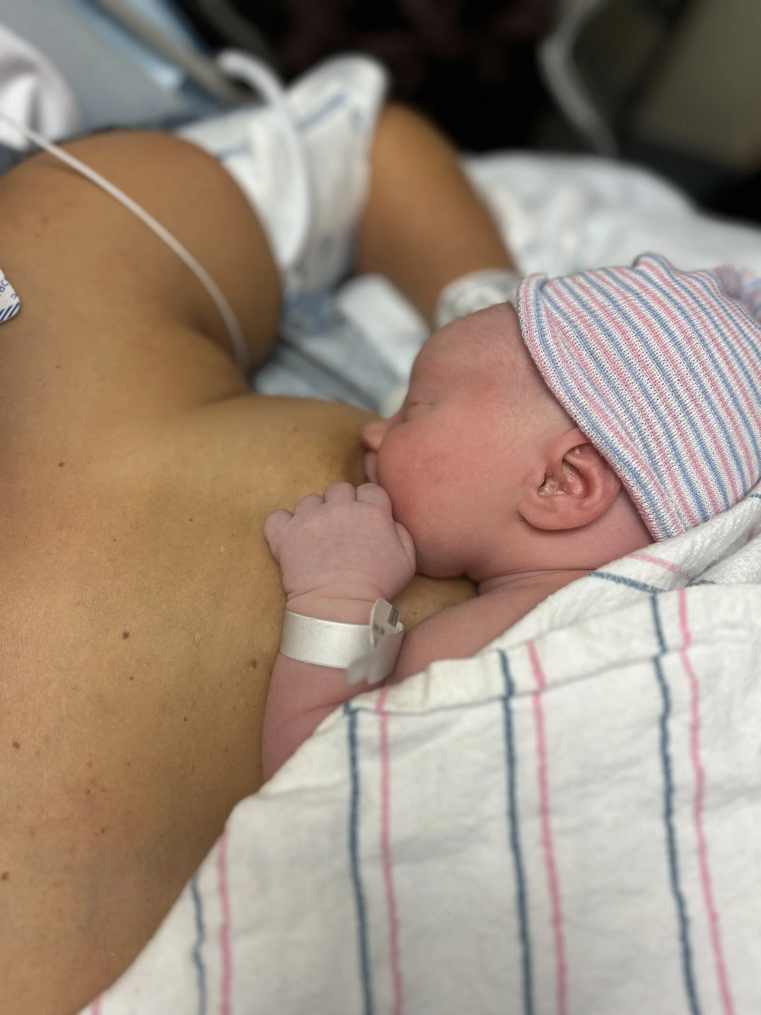 Newborn baby breastfeeding while lying on mother's chest in a hospital, wearing a pink and blue striped hat, with an ID bracelet on wrist.