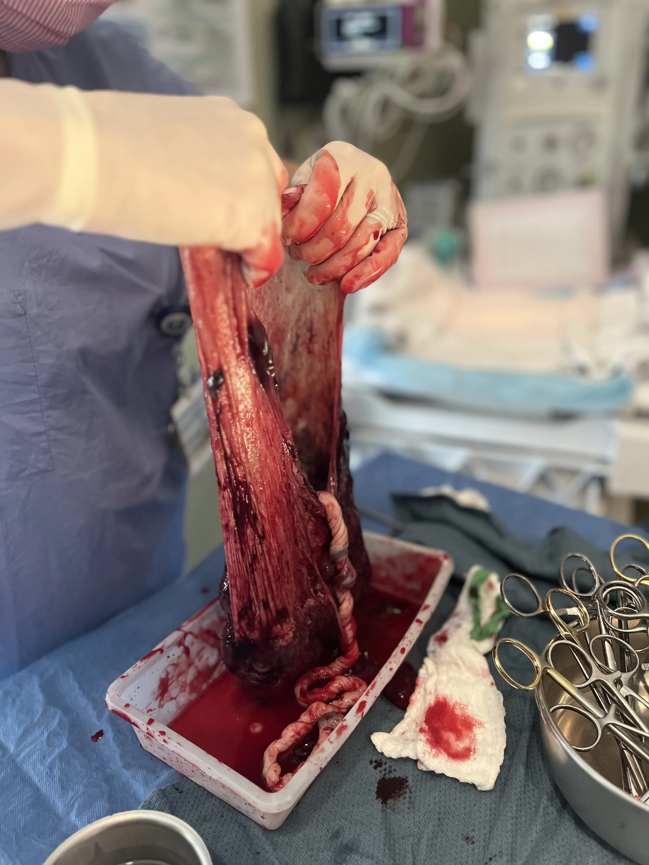 Surgeon holding a human organ, likely a large intestine, during surgery in an operating room.