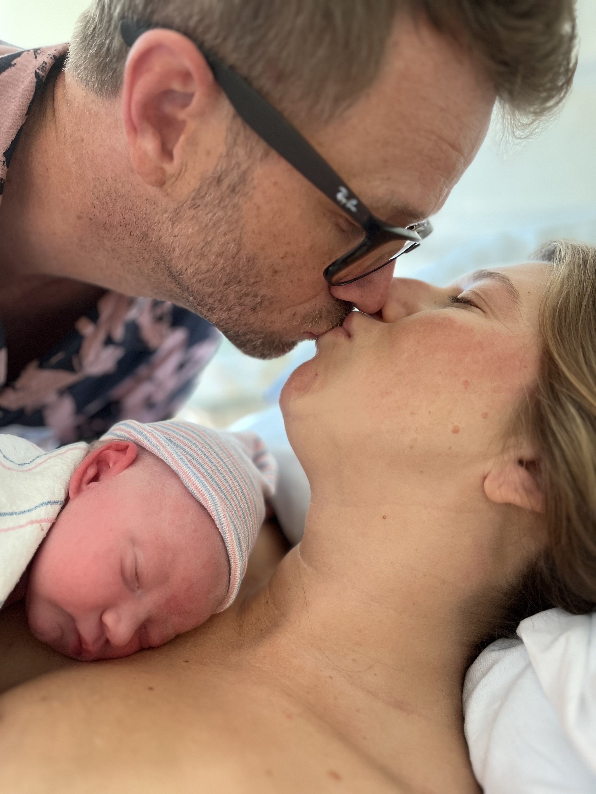 A newborn baby in a hospital bed with closed eyes, wrapped in a striped hat and blanket, lying on a woman's chest. The woman, presumably the mother, is lying close with her eyes closed, and a man with glasses is kissing her on the lips, with his eyes